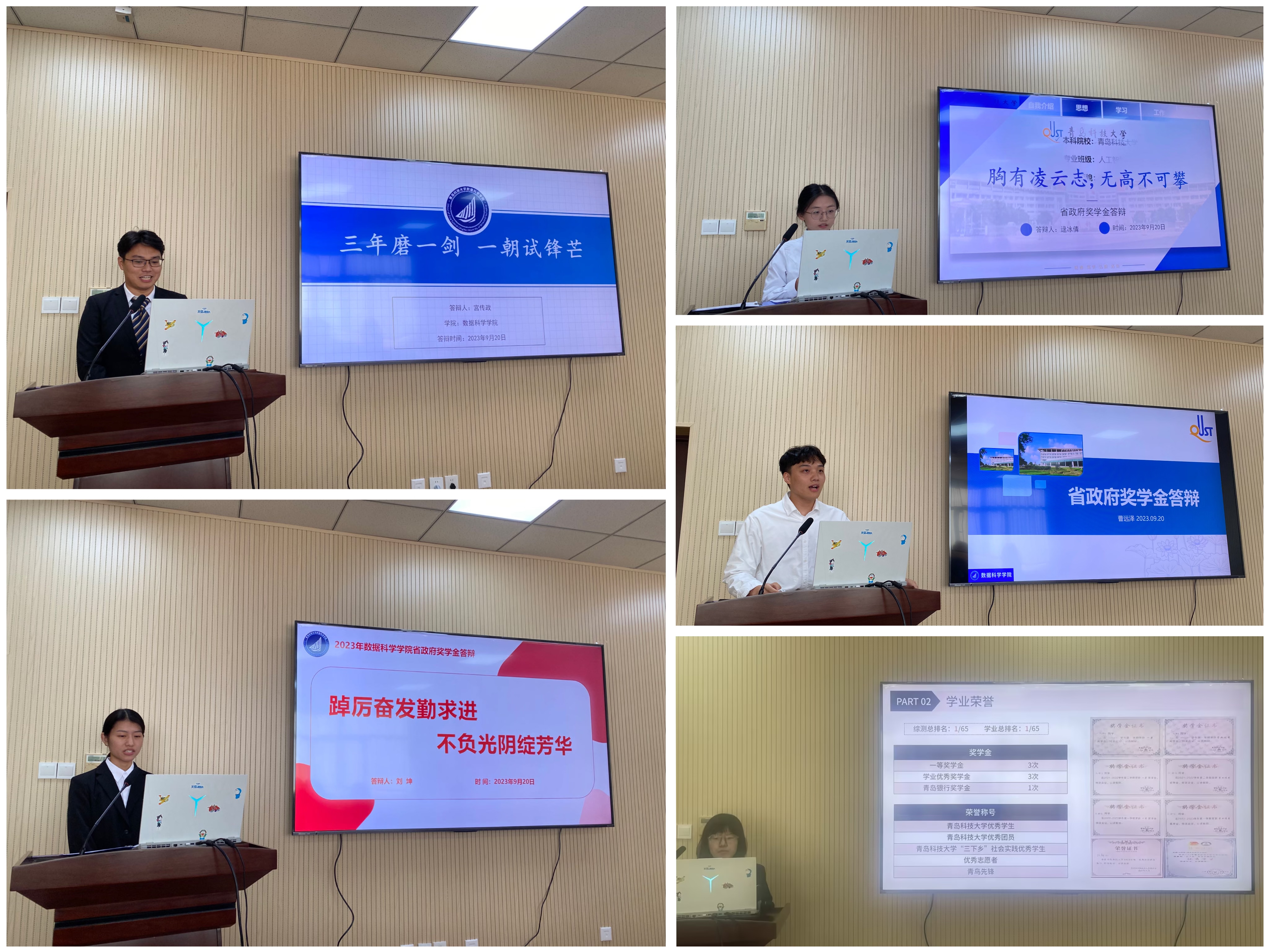 在答辩环节,五位同学依次上台,立足自身优势,通过PPT的形式,从思想情况、学业科研、社会实践、志愿活动等多个方面展示自己在大学生活中的成长与收获,全方位展示了3003新葡的京集团优秀学子的风采。