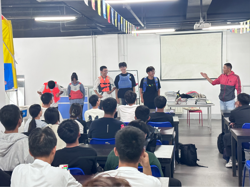 9月23日晚,在大学生活动中心,校体育学院教师、学校帆船队主教练金永泉为同学们讲解了帆船安全知识,并通过生动的案例,让学员们了解了帆船运动中的风险及应对措施。在金教练的指导下,学员们进行了模拟演练,掌握了帆船操作的基本要领。