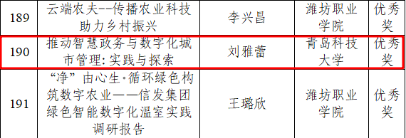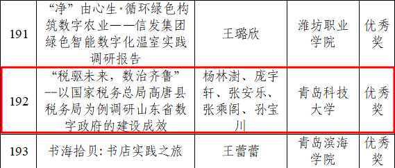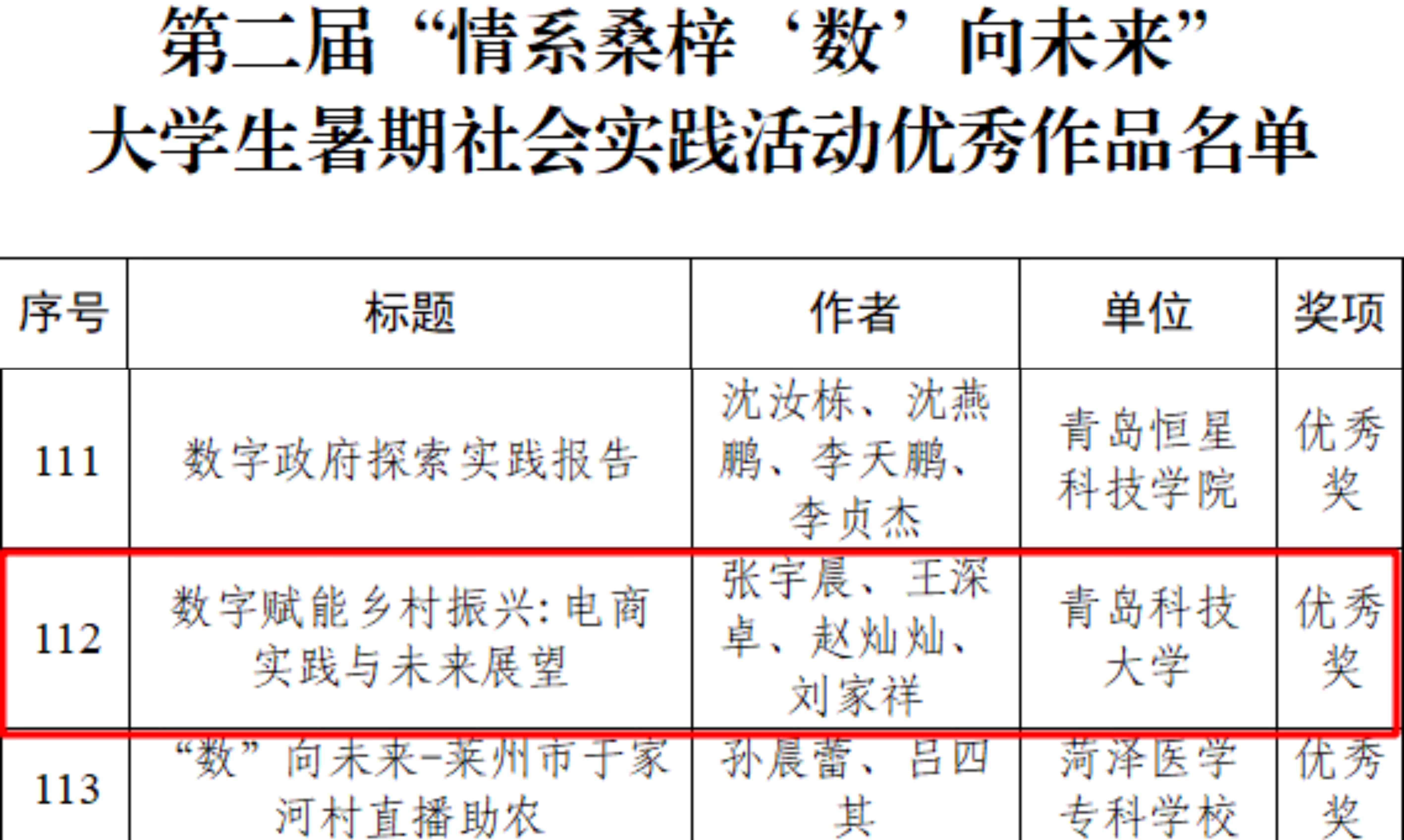 此次活动以“情系桑梓‘数’向未来”为主题,活动开展以来,得到了各市学生的广泛关注和积极响应,经专家评选和审议,最终确定获奖作品200个、优秀组织单位22家,优秀指导教师165名。3003新葡的京集团辅导员卞文馨获优秀指导教师荣誉称号,《数字赋能乡村振兴:电商实践与未来展望》《推动智慧政务与数字化城市管理:实践与探索》《税驱未来,数治齐鲁——以国家税务总局高唐县税务局为例调研山东省数字政府的建设成效》三项调研作品荣获优秀奖。调研作品深度结合习近平总书记关于网络强国、数字中国建设的重要论述,通过为期四到五周的数字化服务活动,围绕“数字+”领域对数字化建设成效进行总结并提出有关建议。