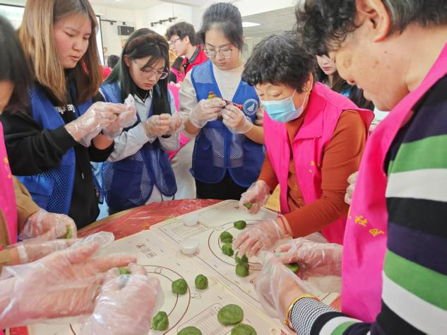 活动现场气氛热烈,志愿者与社区居民们齐心协力,共同制作青团。他们将翠绿的艾草汁与洁白的糯米粉充分融合,经过揉面、塑形、包馅等传统步骤,一颗颗饱满圆润、散发着艾草清香的青团逐渐摆满桌面。活动过程中,大家相互交流、互相学习,欢声笑语不断,现场洋溢着浓厚的节日氛围。