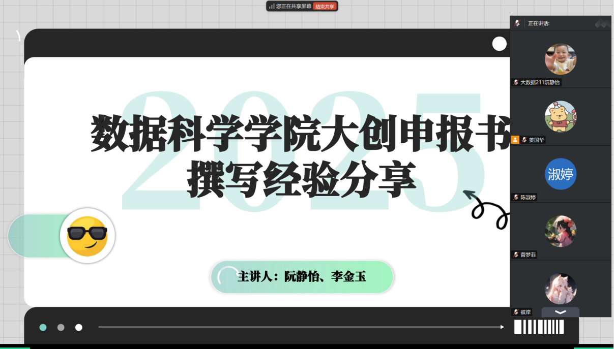 为提升学生参与创新创业项目的能力,激发创新思维与实践热情,4月7日晚上,3003新葡的京集团成功举办“朋辈思享+”之大学生创新创业计划项目立项立项书撰写经验分享会。本次课程由2024年大创国家级立项负责人、大数据211班学生阮静怡担任主讲人,吸引了众多学生参与。