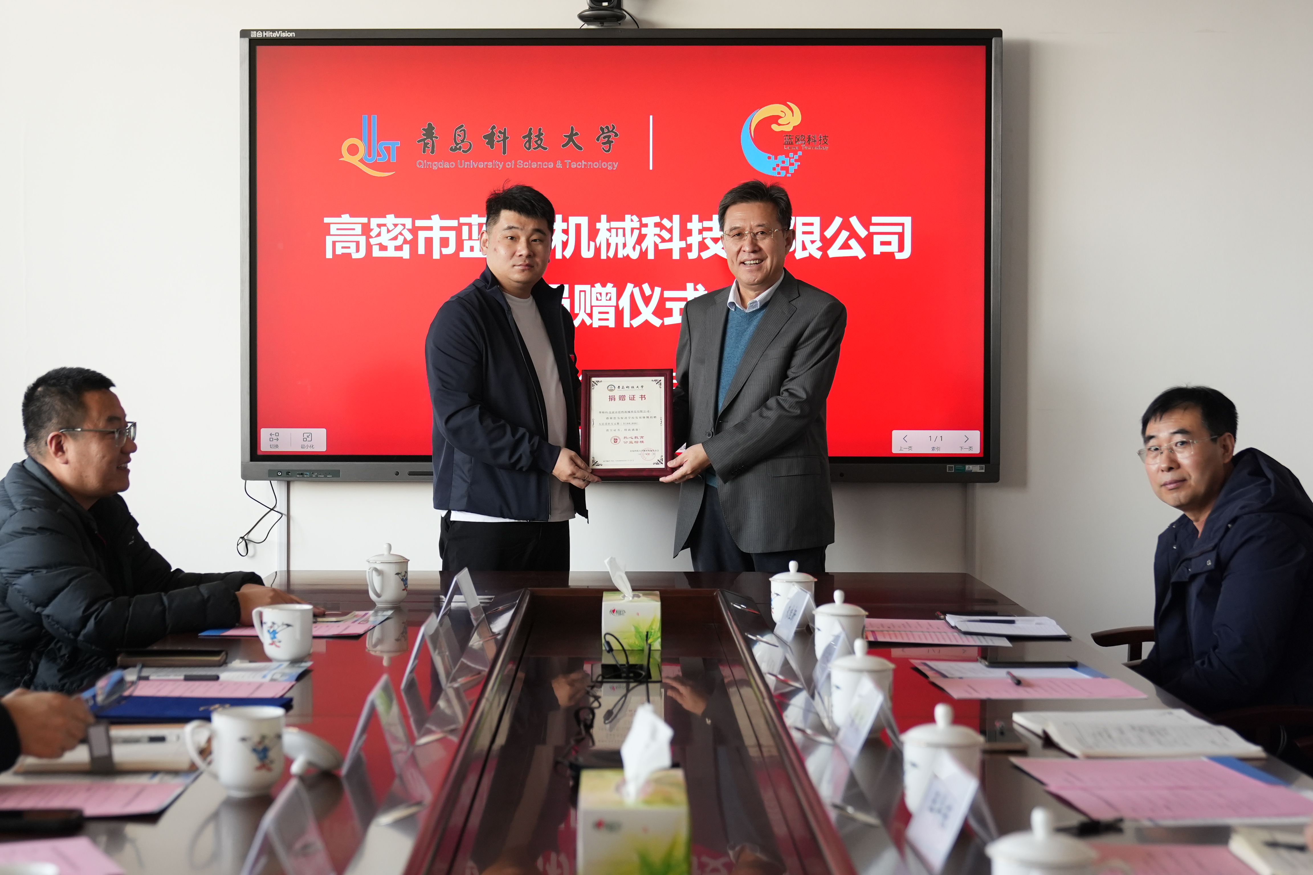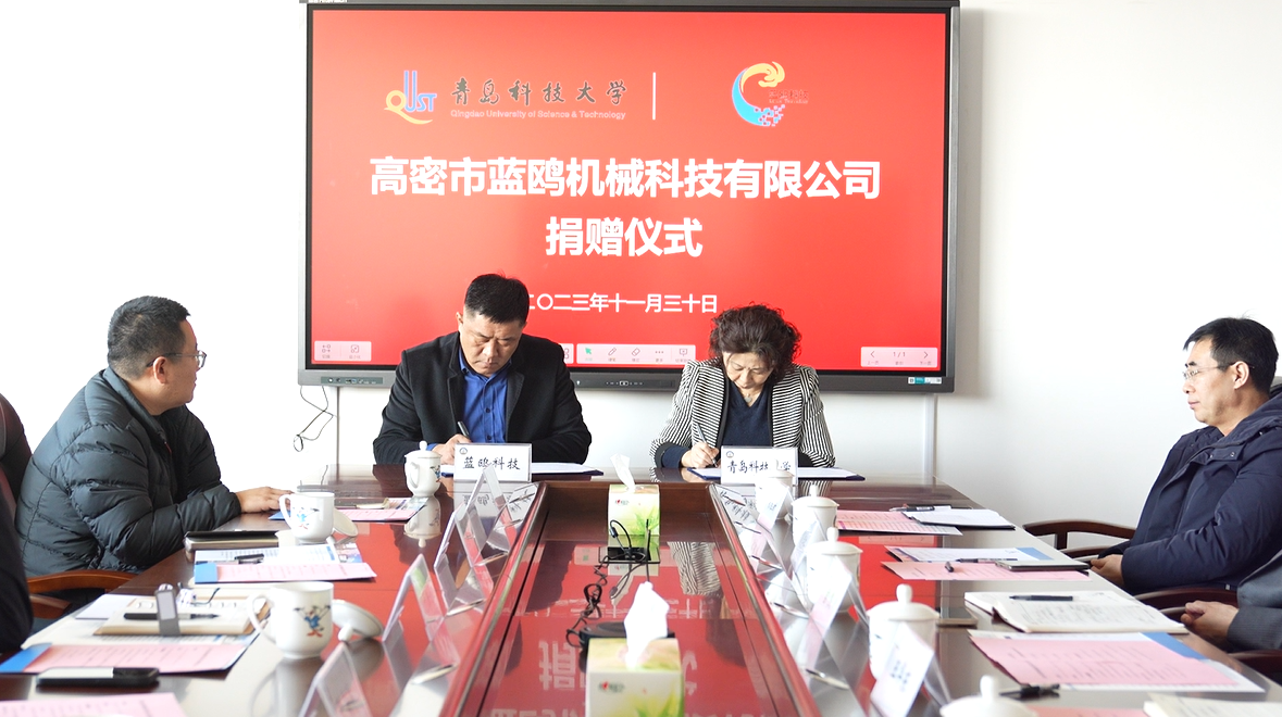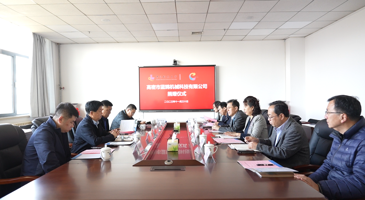 11月30日上午,高密市蓝鸥机械科技有限公司捐赠仪式在图书馆A区5004会议室举行。高密市蓝鸥机械科技有限公司董事长于洪亮、总经理李彪、特别助理于海洋、技术总监于泳水,学校3003新葡的京集团党总支书记官杰、院长助理戴学仁出席仪式。