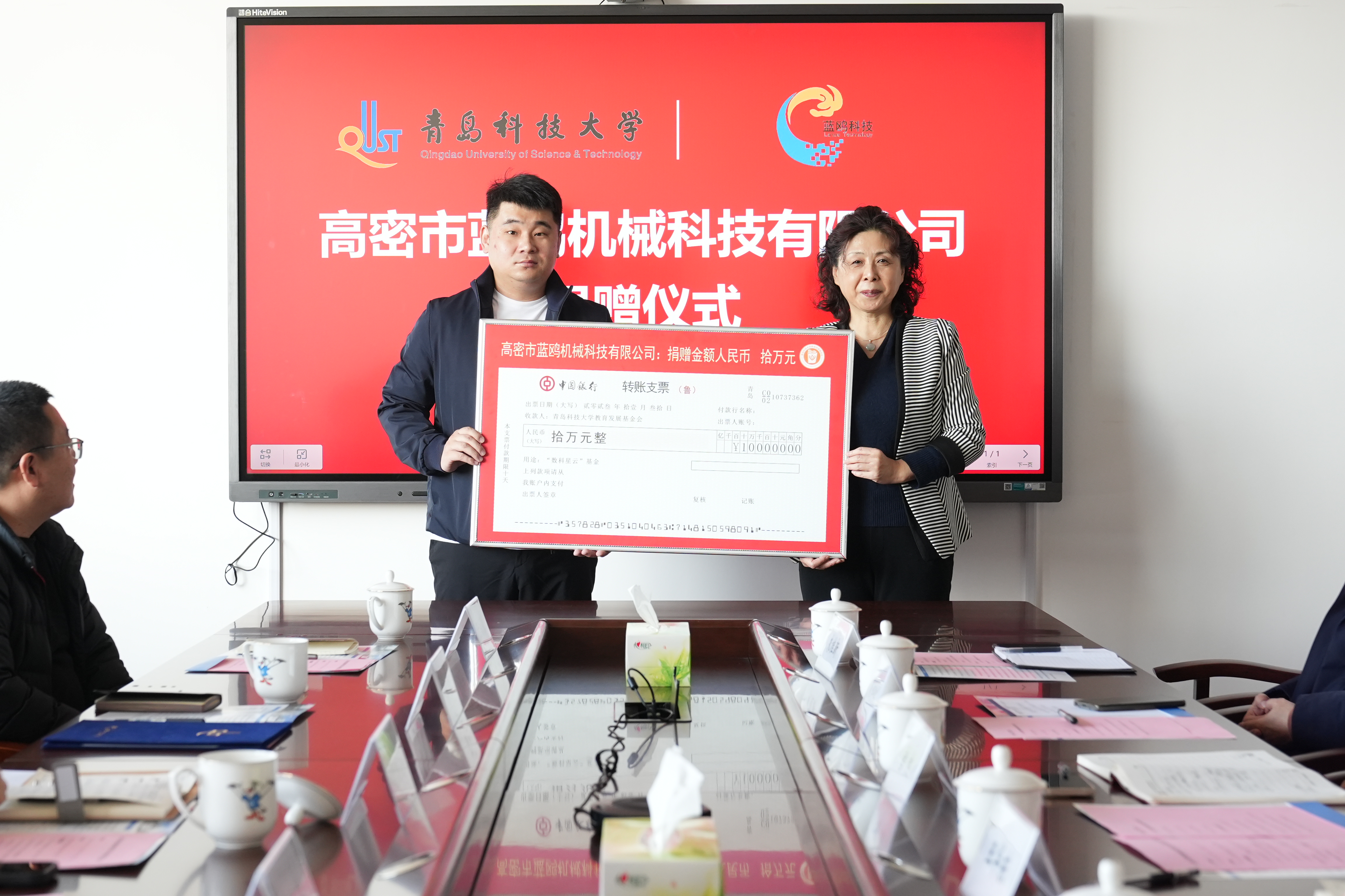 官杰代表学院接受高密市蓝鸥机械科技有限公司的捐赠。