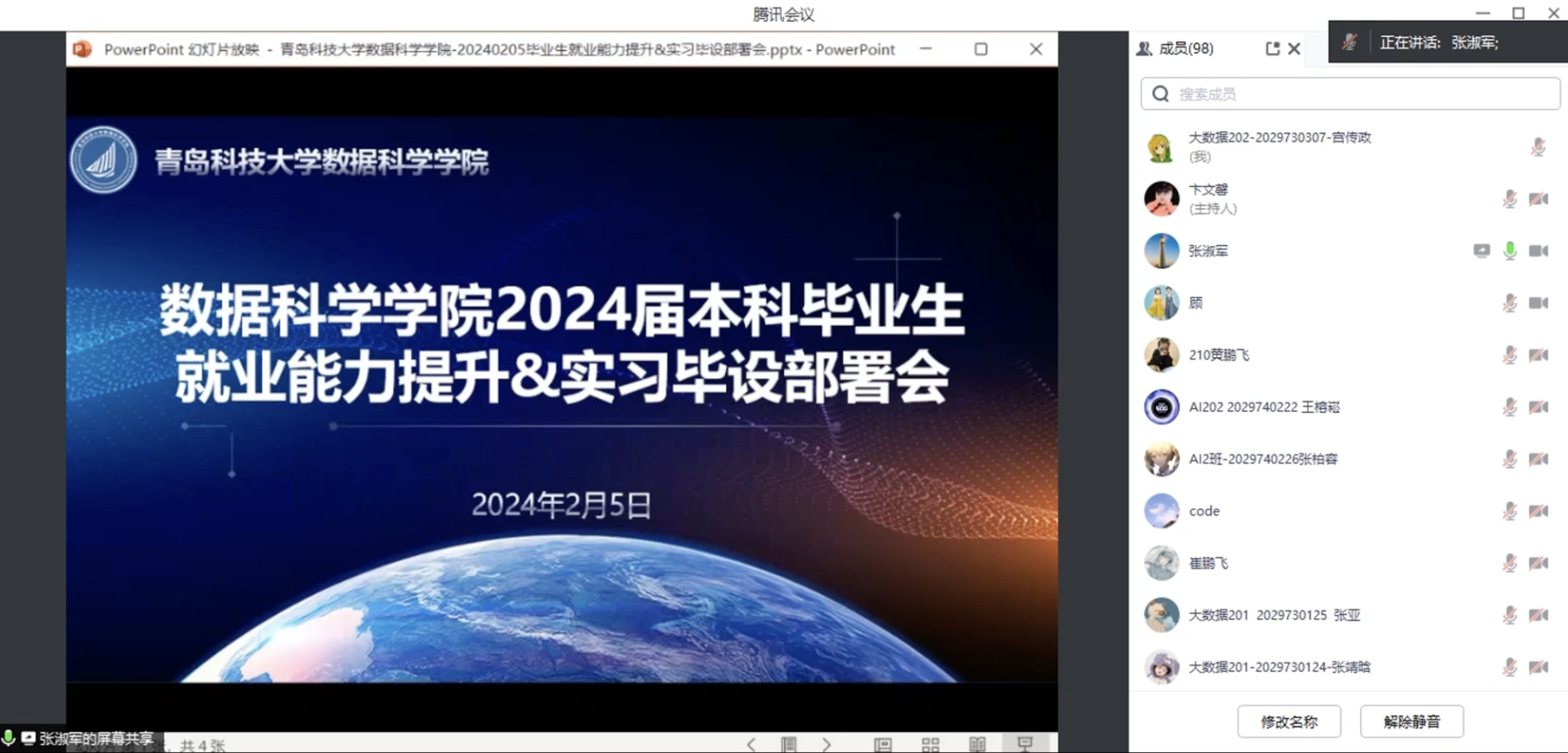 2月5日下午,3003新葡的京集团通过腾讯会议召开2024届本科毕业就业能力提升培训暨实习毕设部署会,学院专职组织员官杰、院长助理张淑军出席会议并部署相关工作,学工办主任兼团委书记顾姗姗主持会议。3003新葡的京集团2024届全体本科毕业生参会。