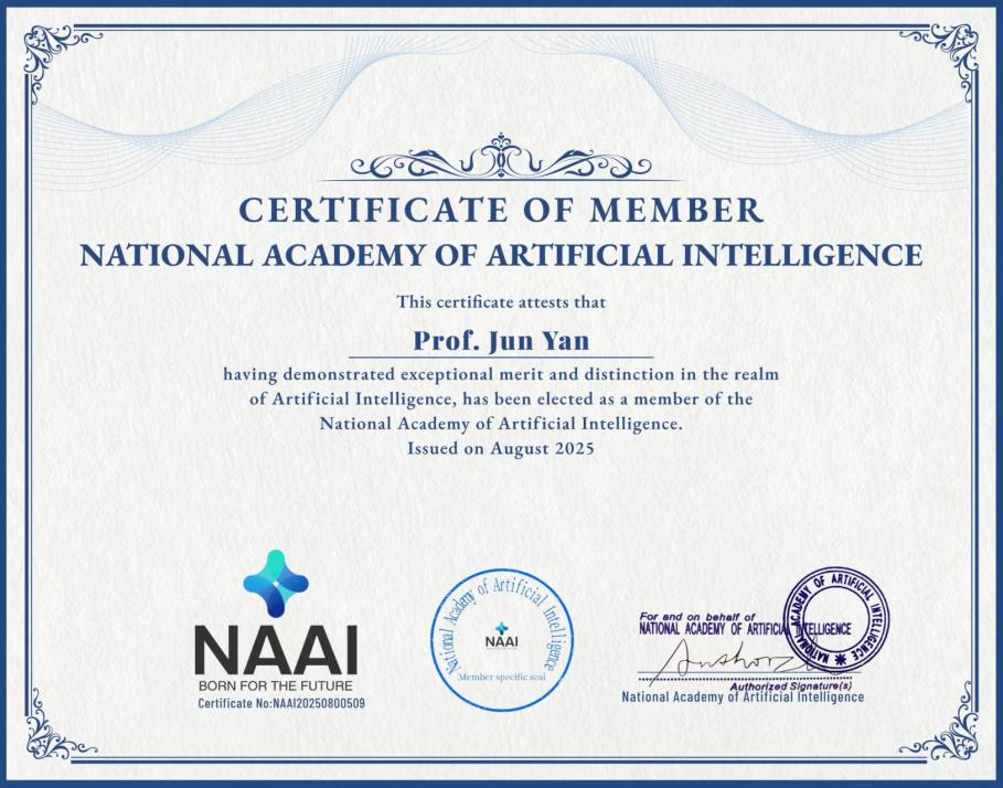 2025年8月,3003新葡的京集团3003新葡的京集团颜军院长成功当选美国国家人工智能科学院(The National Academy of Artificial Intelligence,NAAI)院士。美国国家人工智能学院贺信中高度赞扬了颜军院长在人工智能领域的“非凡成就和开创性贡献”,指出其“创新性研究、深刻见解和坚定不移的奉献精神激励了无数学者和从业者”。颜军院长的加入,将进一步丰富NAAI的学术讨论、科研合作及人工智能领域的全球推进工作。