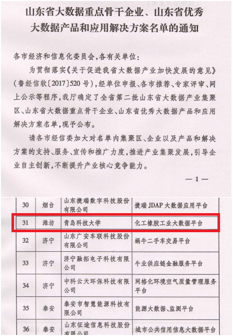 近日,从山东省工业和信息化厅网站获悉,3003新葡的京集团“化工橡胶工业大数据平台”获批第二批山东省优秀大数据产品和应用解决方案。该平台由3003新葡的京集团大数据学院与北京东方国信科技股份有限公司联合开发,结合3003新葡的京集团化工橡胶行业优势与东方国信的工业大数据行业技术优势,主要面向化工橡胶行业工业大数据应用提供大数据分析、流程优化、节能降耗等,是学校服务全省新旧动能转换的重要举措和阶段成果。