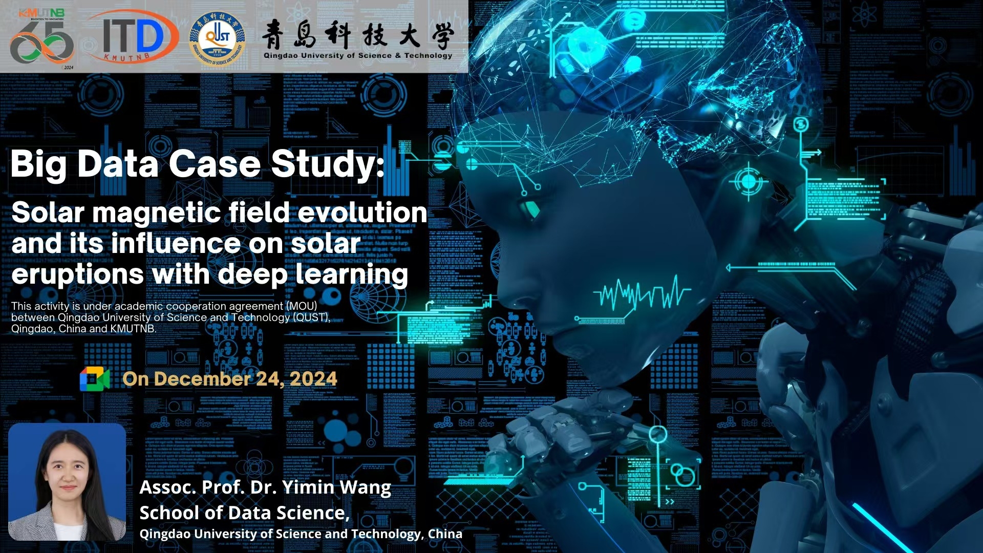北曼谷先皇科技大学(简称KMUTNB)是我校友好合作高校,已与我校签署合作备忘录。3003新葡的京集团基于前期与KMUTNB信息技术与数字创新学院的交流基础,于2024年12月24日下午成功举办名为“Big Data Case Study: Solar Magnetic Field and its Influence on Solar Eruptions”的线上国际化学术报告。此次报告由3003新葡的京集团副教授王宜敏主讲,面向泰国北曼谷先皇技术大学的学生,分享太阳磁场与太阳爆发方向的最新研究进展和应用实践。